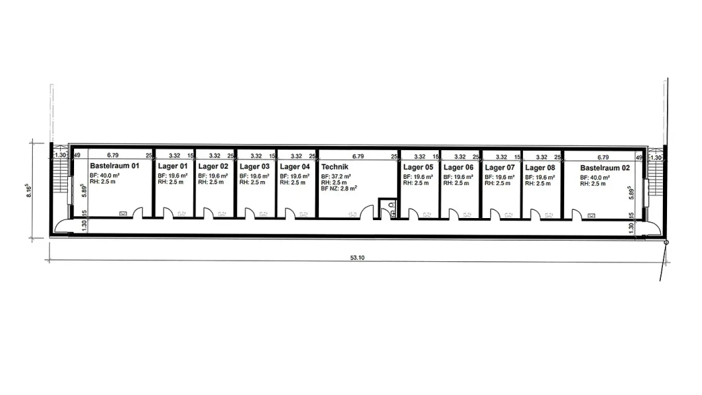 Im UG gibt es 8 Lagerräume à 20 m² sowie 2 Hobbyräume mit Tageslicht à 40 m².